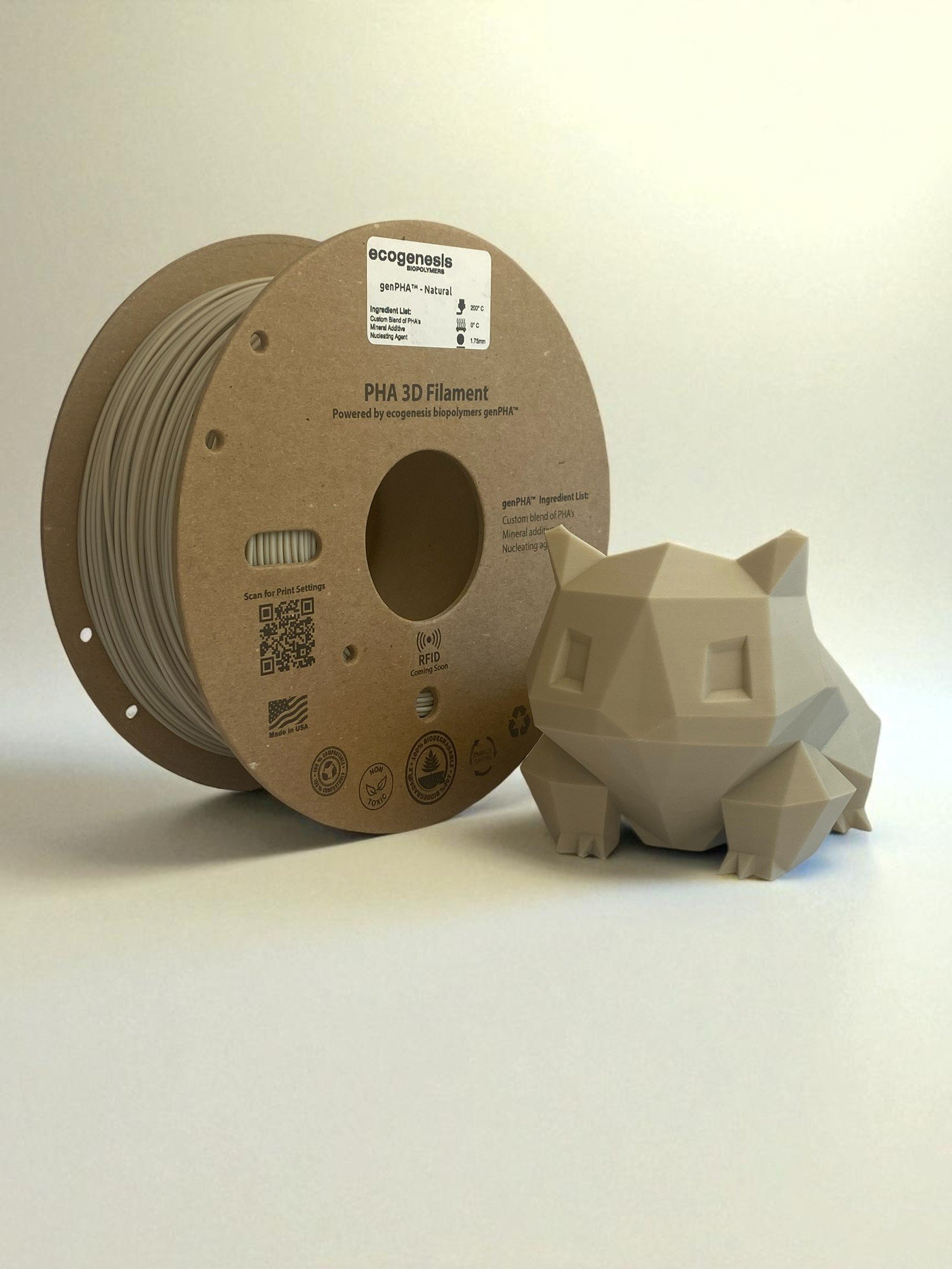 RENEWABLE MATERIAL – genPHA™ is fully biodegradable and compostable.  Made from natural materials and minerals, genPHA™ biodegrades without leaving persistent microplastics behind.  Print without adding microplastics to the environment.  genPHA™ is phthalate-free, BPA-free and CPSIA compliant.  Contains no chemicals listed under California’s Proposition 65.